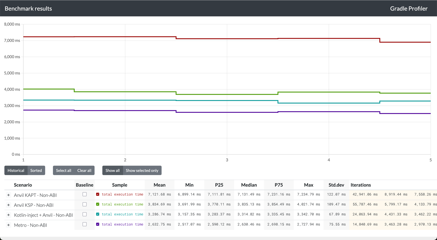 Results as of Metro 0.3.7, Anvil-KSP 0.4.1, Dagger 2.56.2, and Kotlin-Inject 0.8.0 with kotlin-inject-anvil 0.1.6 are as follows.